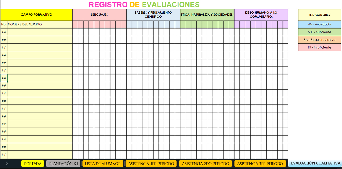 En la sección de registro de evaluaciones por campo formativo, puedes registrar el concepto de evaluación y solo anotar los indicadores que se distinguen por colores en cada casilla. Ventajas del Formato: