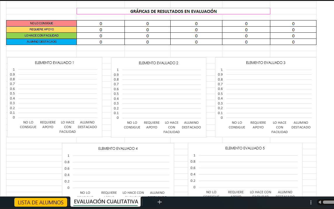El formato genera 5 gráficas diferentes que te permiten evaluar de manera clara y visual el desempeño de tus alumnos en 5 rubros personalizados que puedes elegir según tus necesidades.